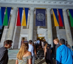Students gathered with faculty and staff at Mead Chapel for their first academic ceremony at Middlebury.