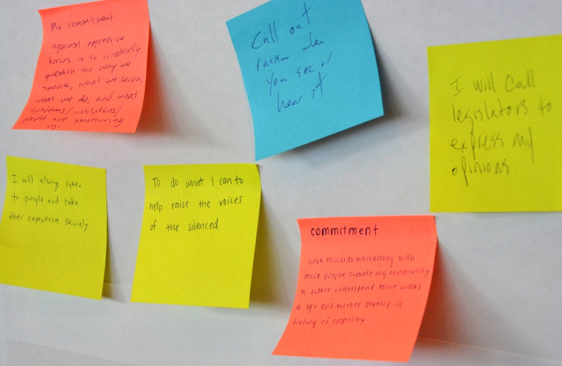 Two white boards on wheels were set up on the side of the dining hall – one for “Convictions” and the other for “Commitments” – and within a quarter hour each board was filled with 50 or more brief, personal statements on colorful notes.