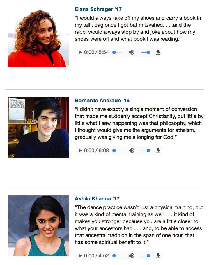In a series of audio clips, generally 5-6 minutes in length, students give candid, thoughtful assessments of their religious experience on campus, which are sometimes funny and often poignant.