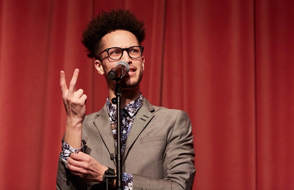 MIDDLEBURY, Vt. – On the first Saturday evening of winter term, as blizzardlike winds whipped through campus, a much warmer scene was unfolding inside McCullough Student Center. The sounds of finger-snapping and roars of laughter filled Wilson Hall as Middlebury College hosted the 10-year anniversary of Verbal Onslaught (VO), the beloved spoken-word tradition, as part of the Alumni of Color 2018 Summit. With music provided by Trenton, New Jersey-based DJ ItsJustAhmed, emcee Christopher de la Cruz ’13 infused the room with energy as he introduced featured alumni performers Clifford Alexander ’15, Sheyenne Brown ’09, Catarina Campbell ’11, Missan DeSouza ’14, Tim Garcia ’14, Debanjan Roychoudhury ’16, Andrew Snow ’15, and Sadé Williams ’14.5.