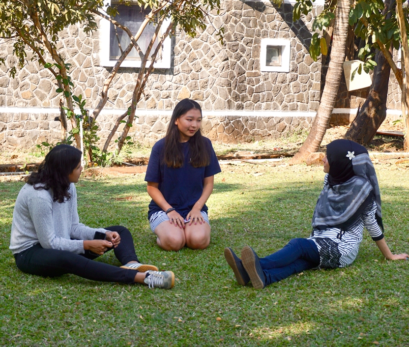 Middlebury BOLD scholars chat with a student from the School of Leadership Afghanistan during their month-long course in Pune, India.