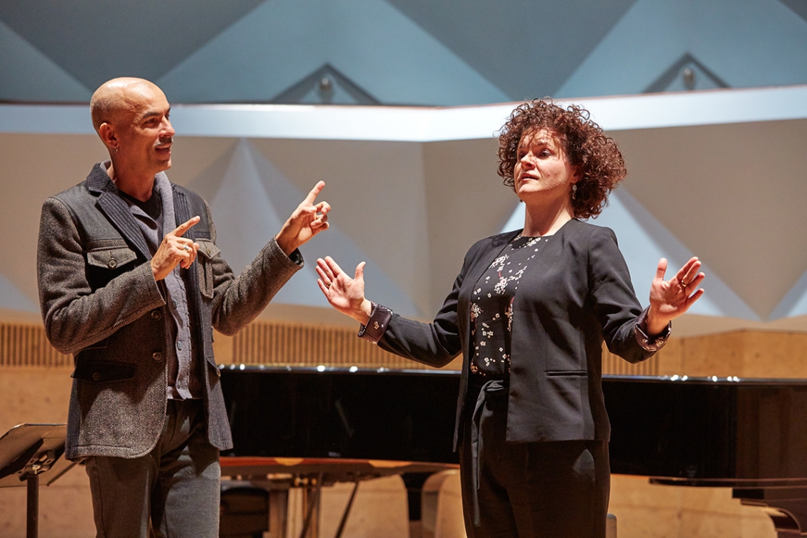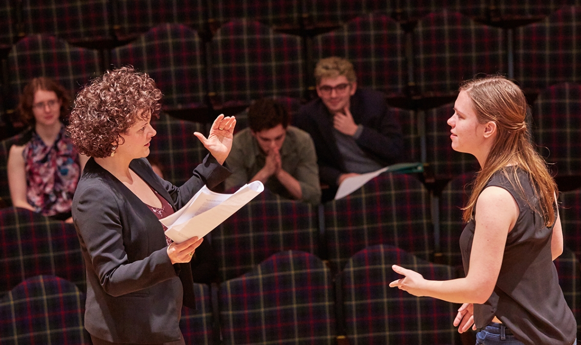 Associate Professor of Theatre Claudio Medeiros works with mezzo soprano Stéphanie Pothier on a scene from the opera Lotus Lives, in which Pothier plays the lead.