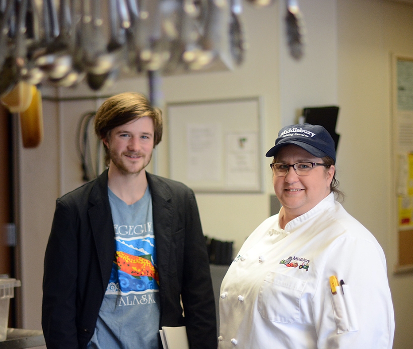 Aube Strickland ’18 with Proctor Chef Tammy Iffland. Strickland, who captains his own fishing boat, sells some of his Alaskan sockeye salmon to the College for special occasions. For Feb Celebration, Iffland grilled the fish and caramelized it with a maple mustard glaze.