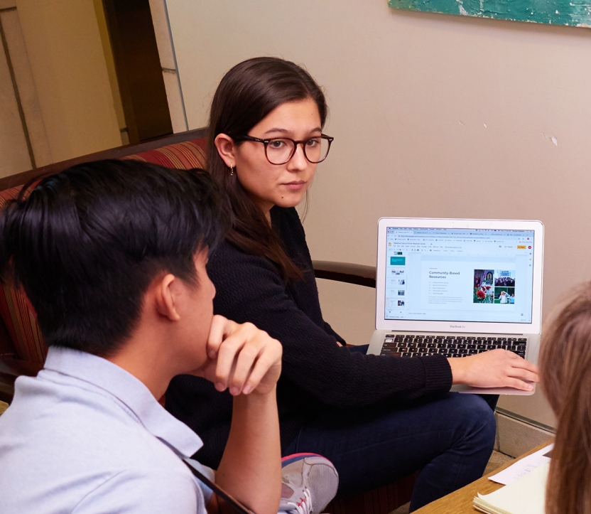 Clockwise: Katie Aman ’19 (in red), Professor Jessica Holmes, Ansley Harralson ’20.5, and Fatmata Bah ’20 discuss work on their final projects.