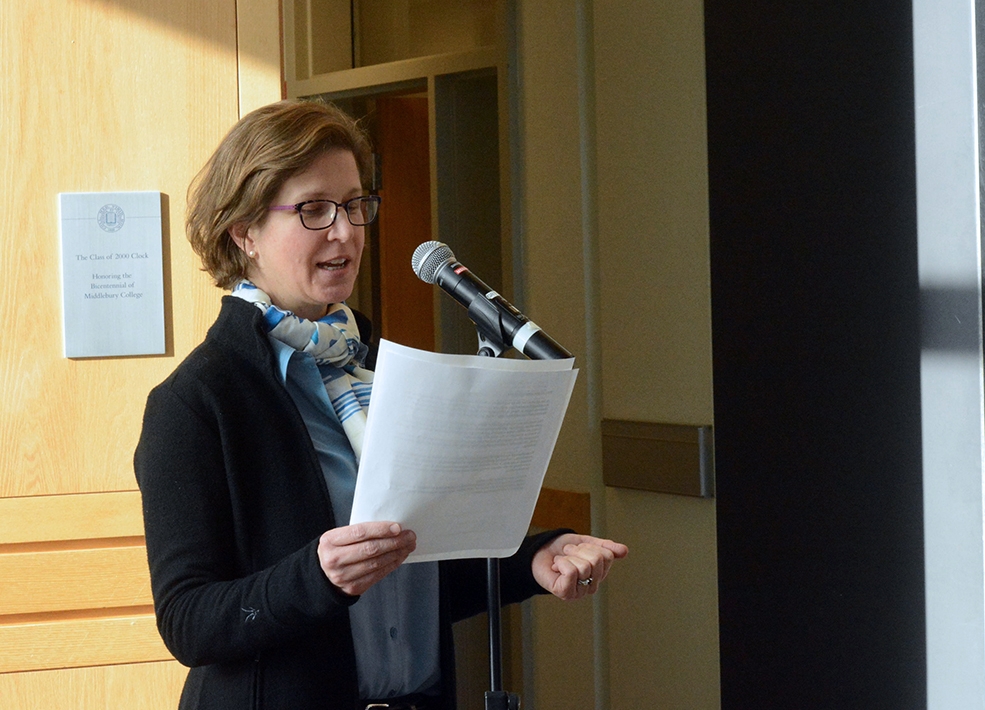 President Laurie Patton also greeted the scholars and guests. “These receptions are some of my favorite events at Middlebury because we see the real fruits of our labors,” said Patton. “I love the fact that articles are part and parcel of the kind of creativity that we think about. I think we sometimes focus on the huge, big project rather than the incremental, smaller projects that are actually way more significant for us intellectually.”