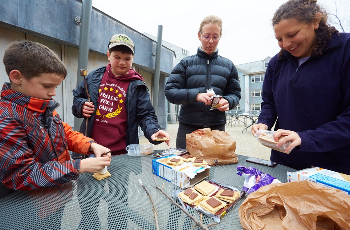 College students Jenny Pushner ’21.5 (right) and Viv Merrill ’22.5 help kids from the Middlebury community make s’mores after a morning of orienteering and building outdoor shelters in the Atwater woods.