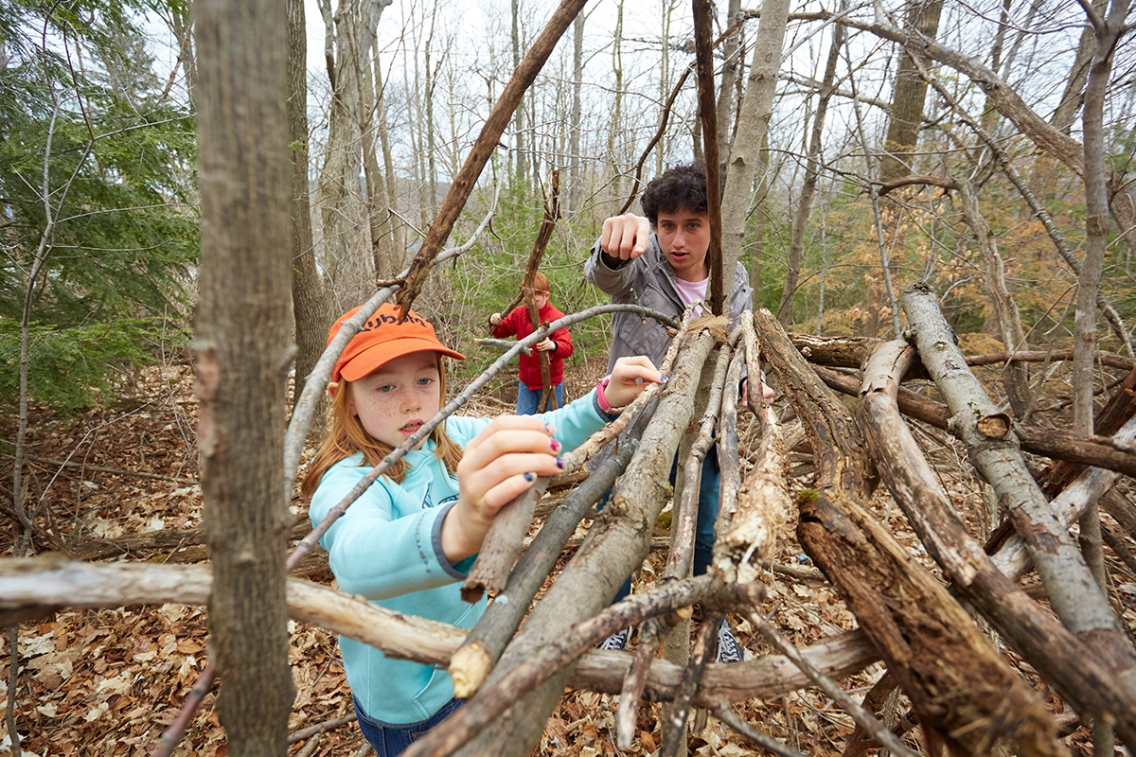 Oscar Psychas ’21, one of the cofounders of WildMidd, works with a young friend on building a shelter in the woods during a recent event teaching area kids outdoor skills.