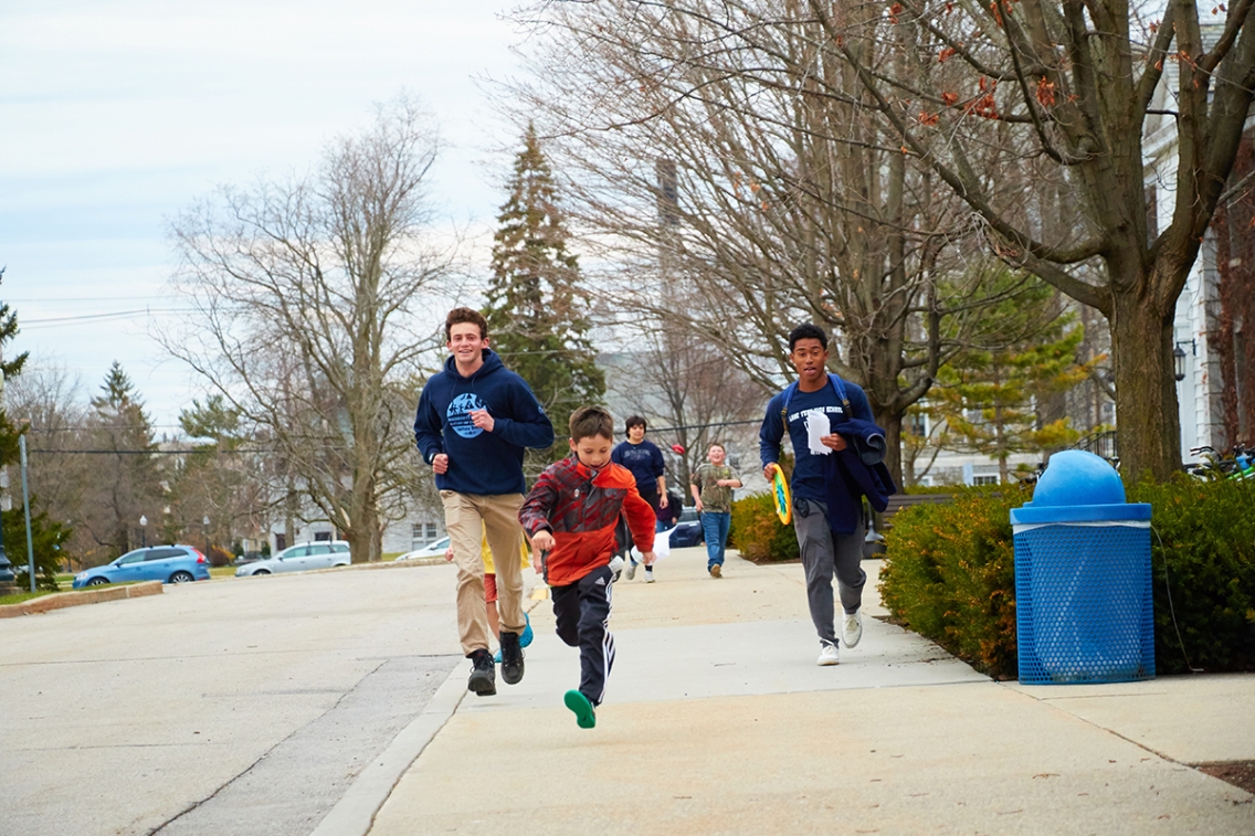 Middlebury students Jacob Freedman ’21 (left) and Sabian Edouard ‘21 follow the lead of a young participant in an orienteering activity on campus. The College students worked—and played—with area kids on a number of outdoor skills.
