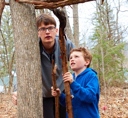 Basil Alfaro ’22 offers some guidance to his young friend during an activity on building shelters that College students directed in the woods behind Atwater Hall.