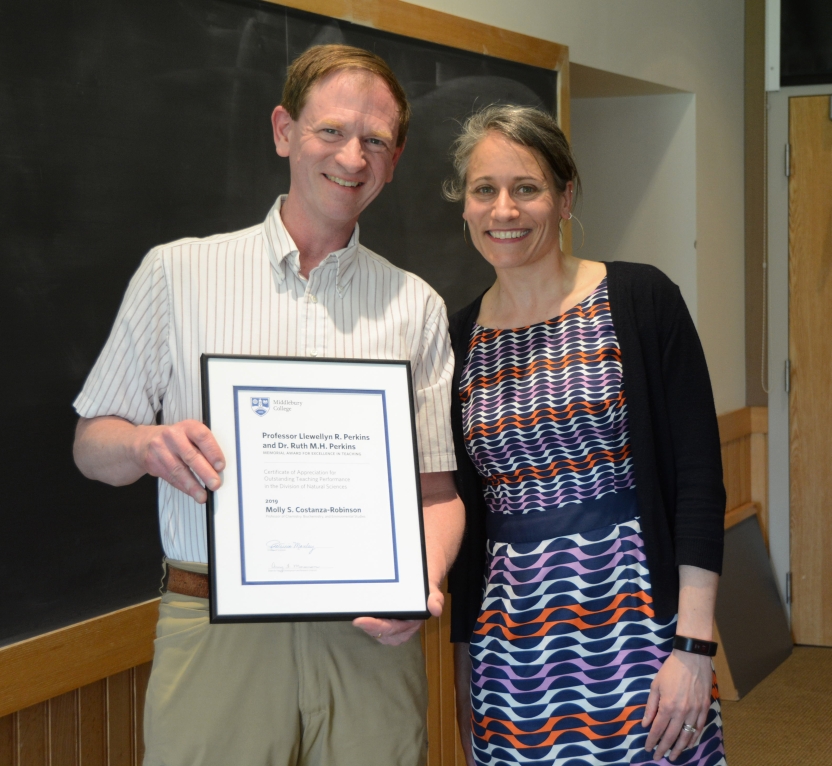 According to one of the students who nominated her for the Perkins Award, Costanza-Robinson “cares deeply about her students, her subject matter, and about forming close-knit communities in both the chemistry and environmental studies departments.” She is credited as one of the faculty members at Middlebury who helps “bridge the gap” between the natural sciences and the program in environmental studies.