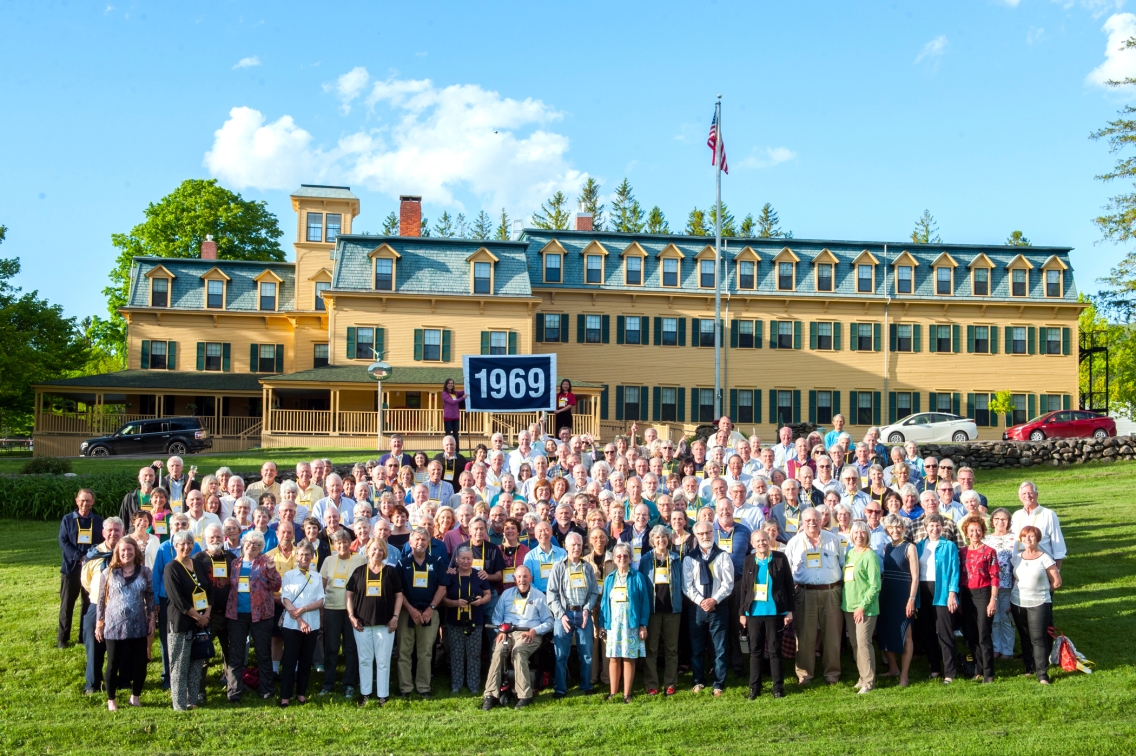The Class of 1969, celebrating their 50th Reunion, lined up for a photo at the Bread Loaf campus.