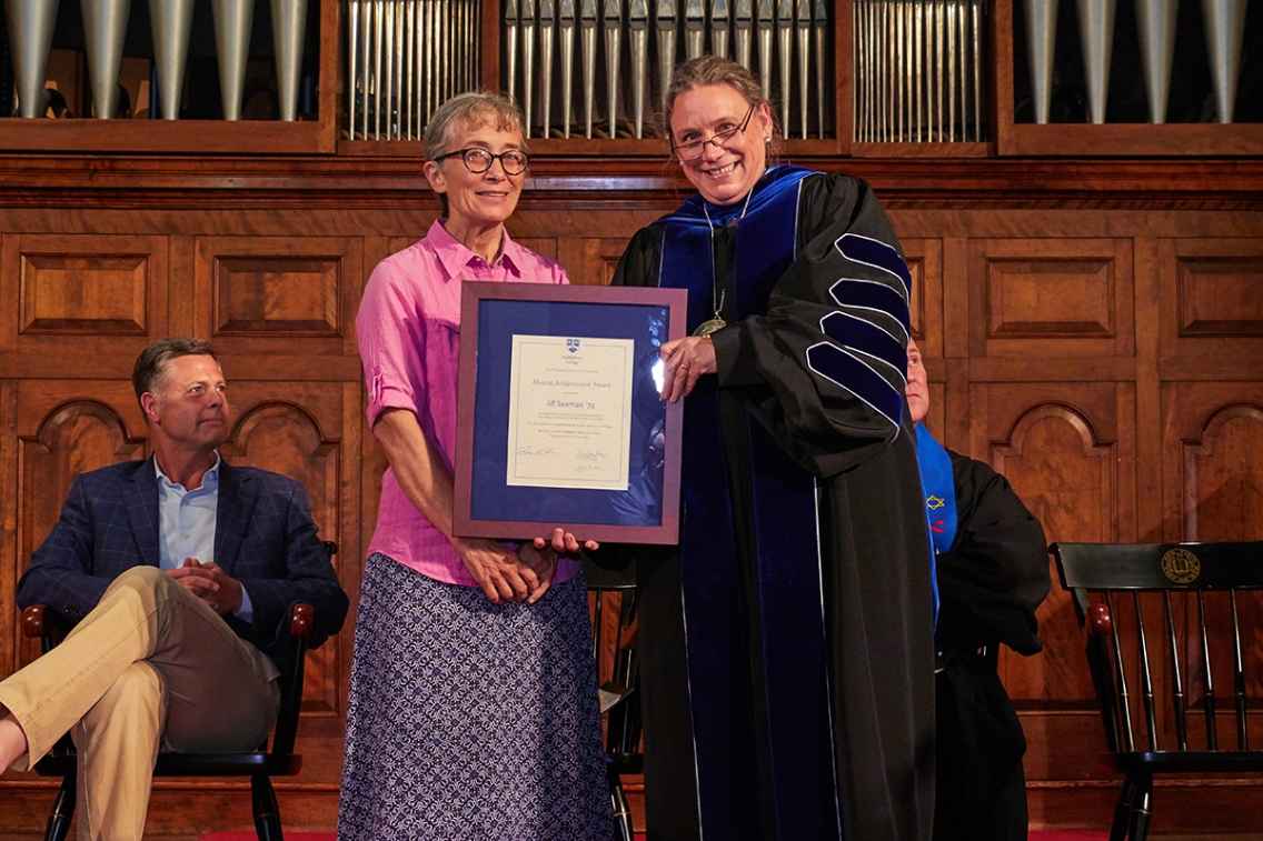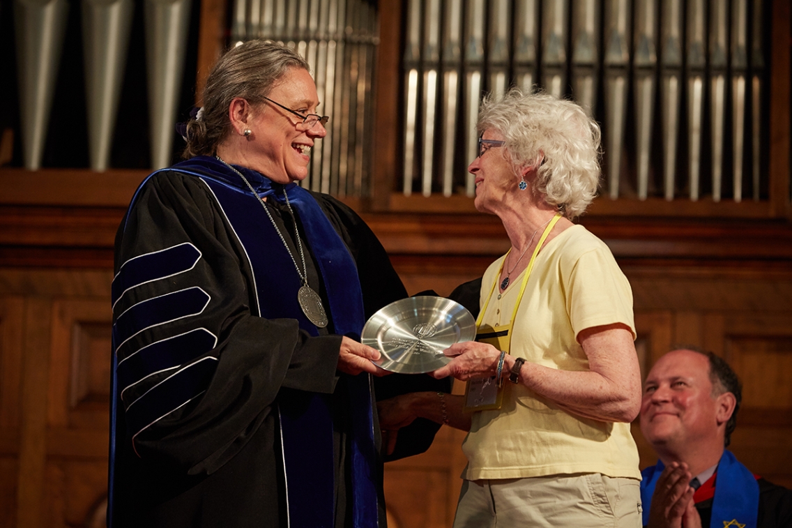 Left: President Laurie Patton presents an Alumni Plaque award to Mike Heaney ’64 at Reunion. Right: Patton presents an Alumni Plaque award to Mary MacArthur Wendell ’69 at Reunion Convocation.