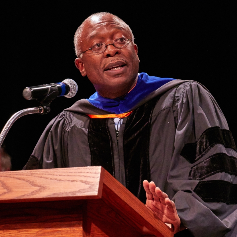 The copresidents then introduced the Commencement hooder, actor Stephen Thorne, and speaker, former Bread Loaf faculty member, and current associate director Lyndon Dominique. Thorne, a member of Trinity Repertory Company’s resident acting company and director of the 2019 Bread Loaf Acting Ensemble’s production of All’s Well That Ends Well, has been a member of that ensemble for 18 summers.