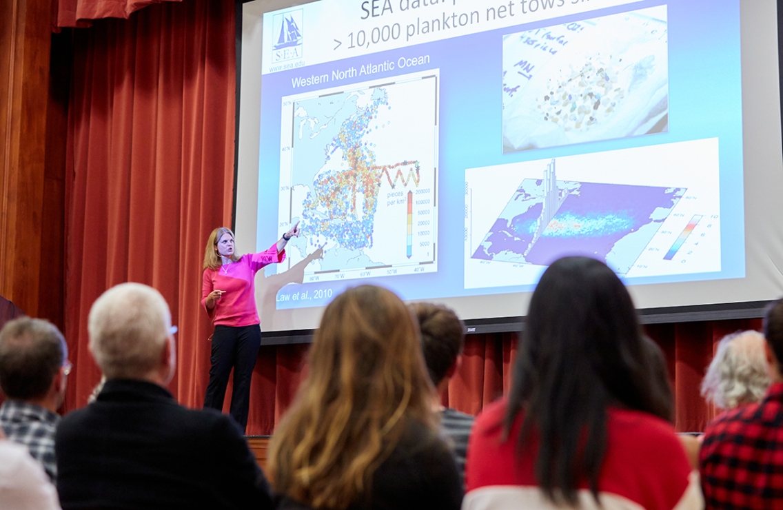 Kara Lavender Law, who gave the 2019 Clifford Symposium keynote address, is a research professor of oceanography at the Sea Education Association in Woods Hole, Massachusetts. She spoke to an audience in Wilson Hall on September 19.