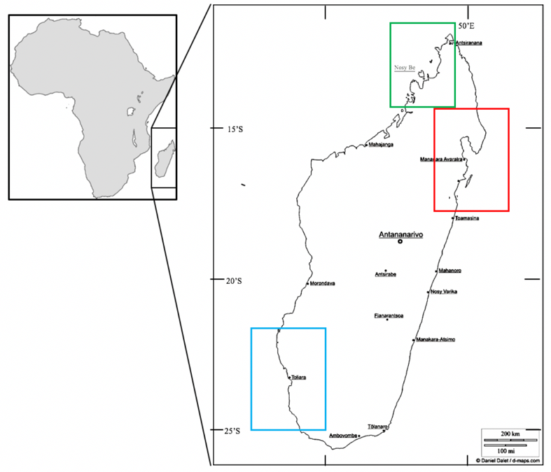 A map of Madagascar shows marine protected areas that will be the focus of NSF-funded research by Prof. Mez Baker-Médard.