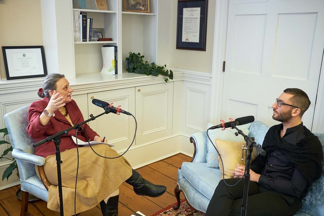 President Laurie Patton interviews Firas Nasr ’15 in her office at Old chapel for the new podcast, Midd Moment.