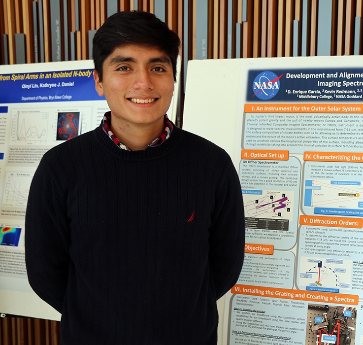 Diego Garcia ’20 presented a poster based on his research performed this past summer at NASA’s Goddard Space Flight Center titled “Development and Alignment of the Thermal Infrared Composite Imaging Spectrometer (TIRCIS) Instrument.” Garcia’s NASA-supported research involved development of a prototype infrared instrument for a future space mission. Designed for the study of outer solar system bodies, this instrument would advance our understanding of objects like the volcanically active Io, Jupiter’s third largest moon.