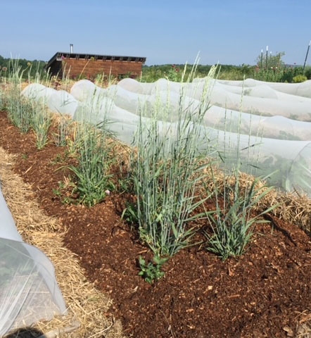 A row of young, established Kernza, a perennial grain, grows between rows of annual crops at the Knoll, the College’s education garden. The College is considering including Kernza in its agroforestry plans.