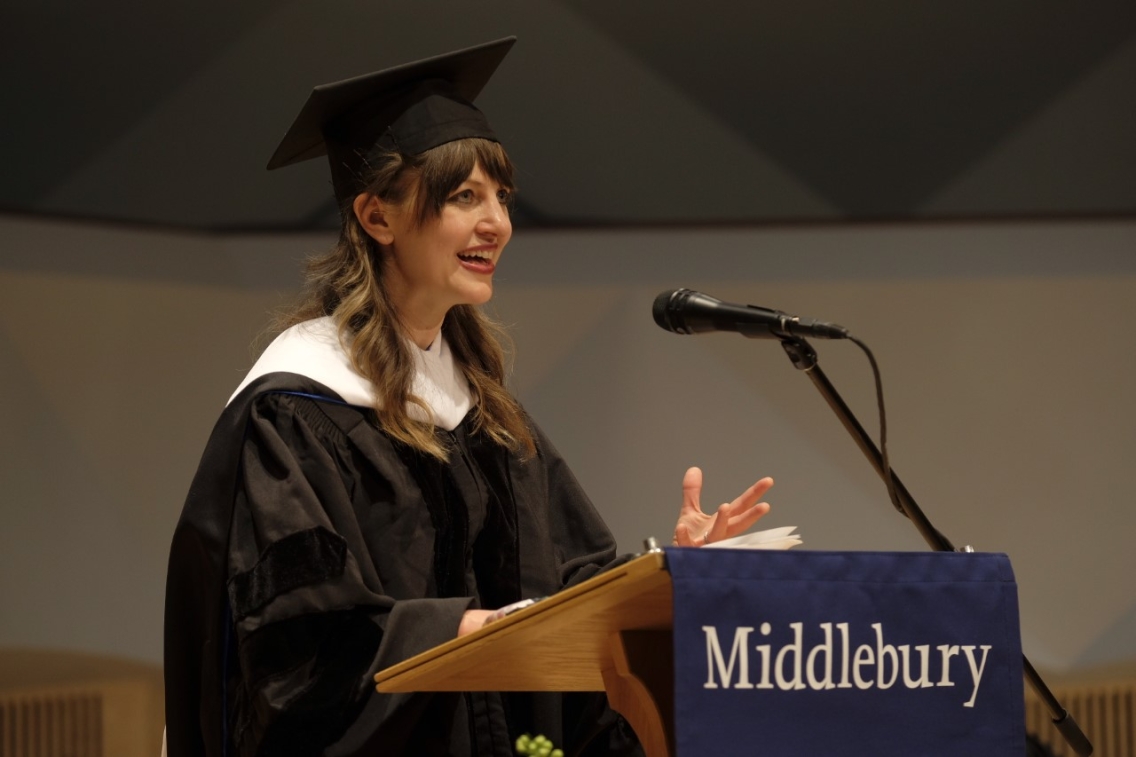 Mitchell encouraged the graduates to think big and to seize this time of life—their early 20’s—which she described as “a time of genius.” She offered two bits of advice. First, they should create occasions to rise to. She recalled a time not long after graduating from Middlebury when the idea for a folk opera based on the Orpheus and Eurydice story drifted into her head. With just a few songs written, she had already secured a grant, musical collaborators, and a series of performance venues in Vermont.