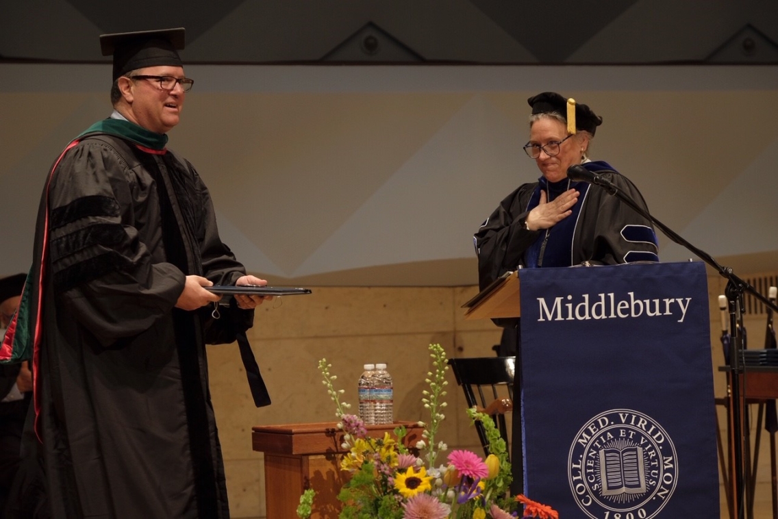 After welcoming the graduates and guests, President Laurie L. Patton presented the first-ever Middlebury Medal to Dr. Mark Peluso, Middlebury’s chief health officer and College physician.