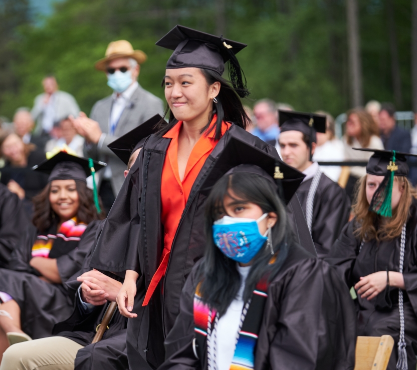 On a cool, sunny Saturday afternoon, the Middlebury College community gathered to celebrate a historic Commencement for 481 members of the Class of 2021. Graduates and their guests assembled at six separate outdoor venues, to comply with pandemic health and safety regulations, each with a stage and large video screen. At an event that was hard to imagine just a few months ago—and one that required careful planning without the benefit of a rehearsal—joyful bursts of applause and cheering could be heard all over campus.