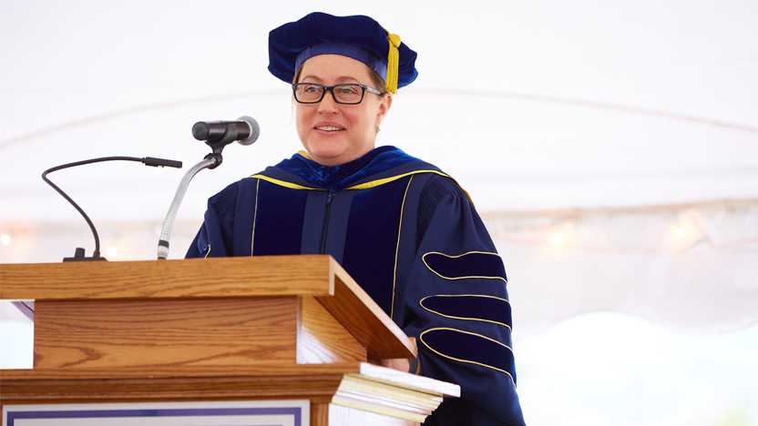 Middlebury President Laurie Patton then introduced the conferring of degrees, asking what it means to learn in a place and time when democracy is at risk, and what it takes to heal and to imagine a new democracy. Patton read the John Daniel poem “Dependence Day,” which proposes that interdependence is necessary for creation and democracy to occur. She urged Bread Loaf’s graduates to understand the world in this way: to find literature of interdependence and to find relationships when it seems there are none.