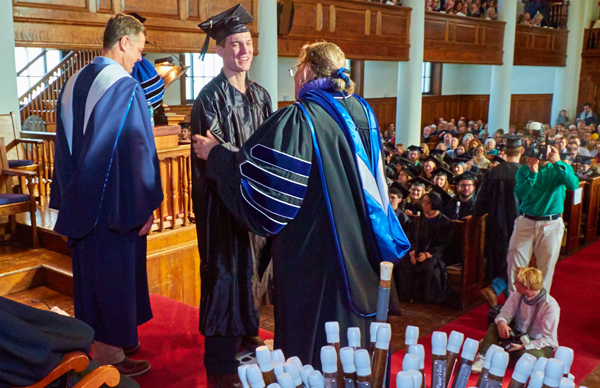 The ‘Feb’ class gathered for a ceremony at Mead Chapel before heading up to the Snow Bowl for the traditional ski-down.