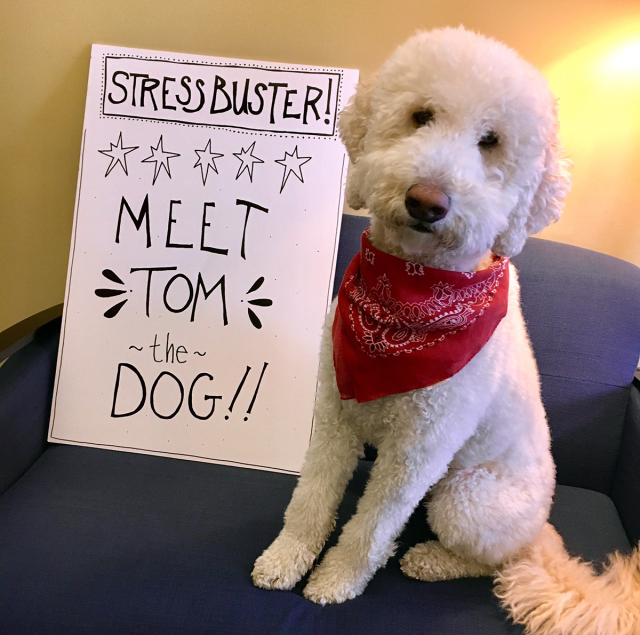 A few minutes with Tom proved an excellent antidote to finals-week stress for students at Davis Family Library.
